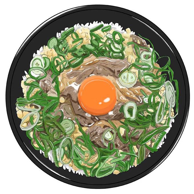 ごはんの上に②をかけて、天かす、きざんだネギ、最後に生卵を中央に乗せればできあがり。