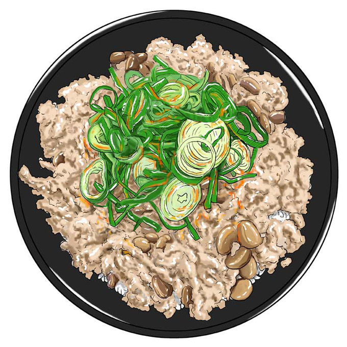 - ②と③を混ぜてごはんの上に乗せ、きざんだネギとラー油を全体にかければできあがり。