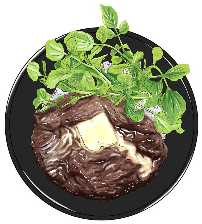 - ④をごはんの上に乗せ、フライパンに残った油に水と醤油を加えて温めたソースをかける。クレソンを添えてバターを乗せればできあがり。