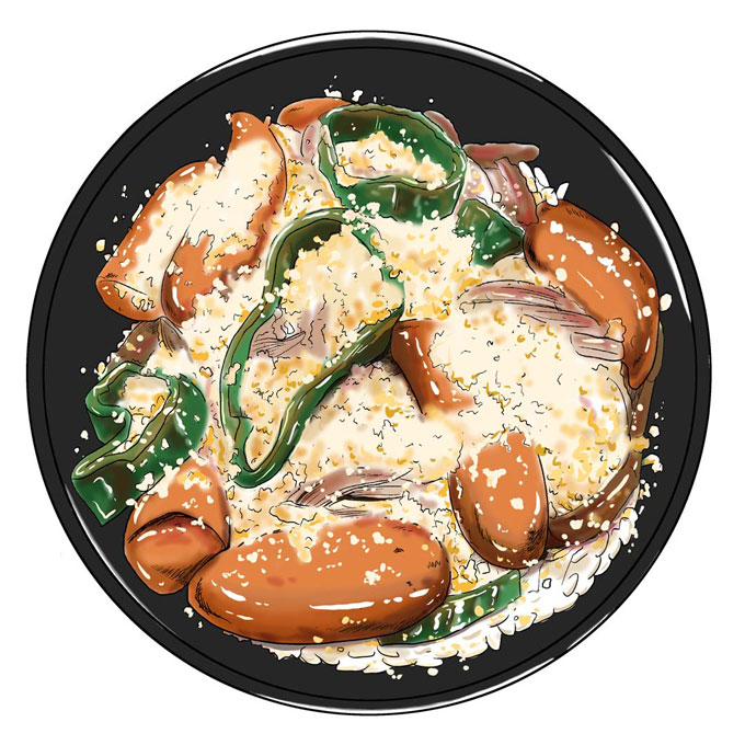 - 火が通ったらケチャップで味付けをして、ごはんに乗せパルメザンチーズをかければできあがり。