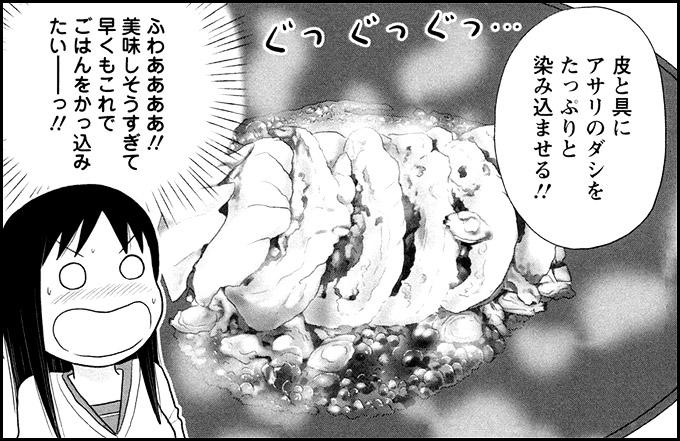②を醤油と塩で味を調えてから、そこにスライスした肉まんを入れ、出汁をたっぷりと吸わせる。