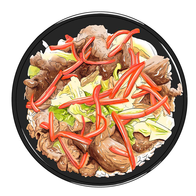 - 最後に醤油と砂糖で味を調えて、ごはんに乗せて、白菜の浅漬けと紅しょうがを絡ませればできあがり。