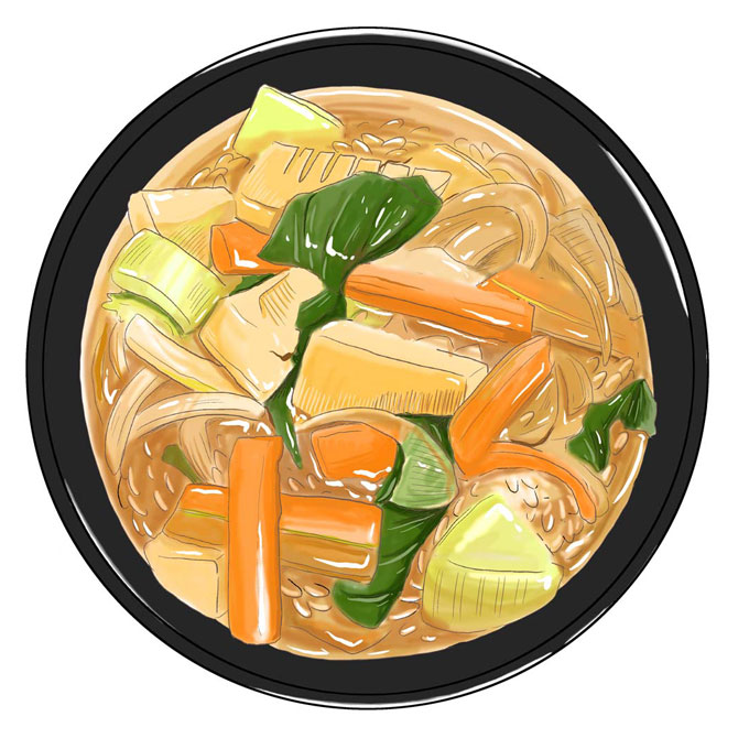 フライパンに油をひき、野菜を中華スープの素と醤油を加えてよく炒め、水を加えて煮る。
