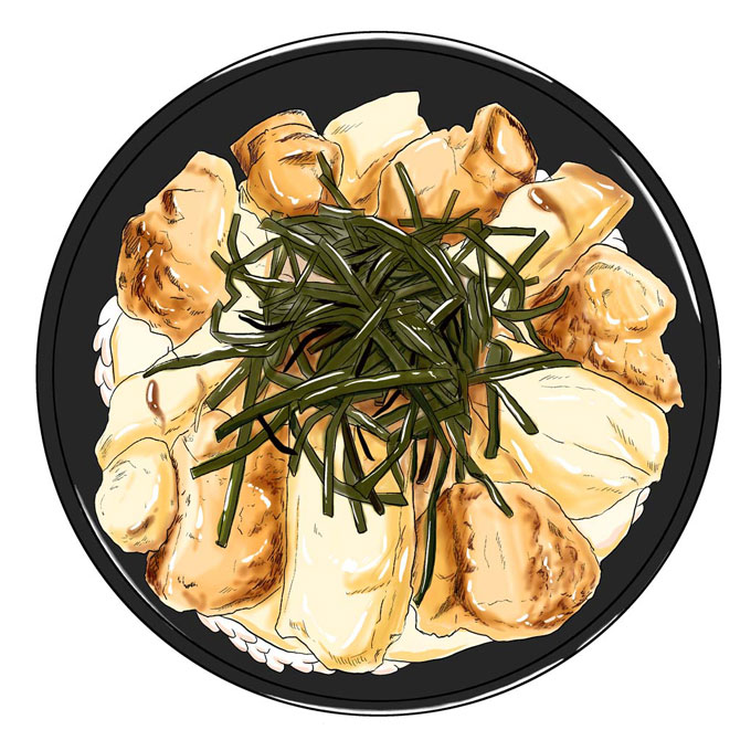 ②の上に③と大根おろしを乗せ、きざみのりと醤油をかければできあがり。